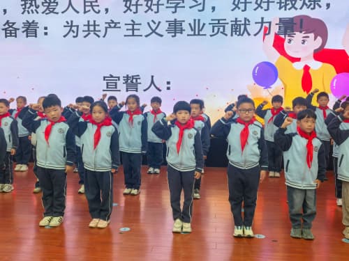 仪式在庄严的氛围中拉开序幕。全体师生起立,出旗曲奏响,少先队员们身姿挺拔、行队礼致敬,鲜艳的队旗在校园中熠熠生辉。随后,嘹亮的《中国少年先锋队队歌》响彻校园,歌声里满是少年们的朝气与对少先队组织的向往。