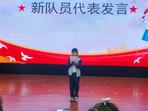 新队员代表上台发言,分享了加入少先队的激动心情与美好憧憬,表达了将以少先队员的标准严格要求自己、努力学习、奋勇争先的决心。随后,大队辅导员老师为全体队员寄语,殷切嘱托新队员们要牢记先烈嘱托,珍惜胸前的红领巾,在学习中成长,在实践中进步,争做有理想、敢担当、能吃苦、肯奋斗的新时代好少年。